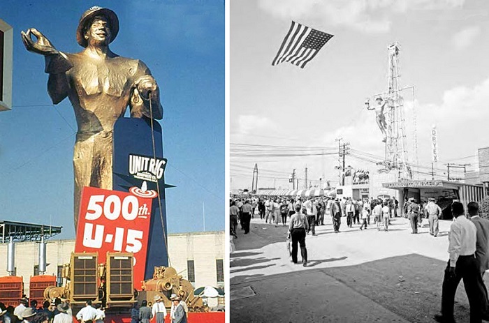 In 1953, a golden “roustabout” statue conceived by the Mid-Continent Supply Company of Fort Worth, Texas, proved so popular it returned in 1959 after receiving a makeover.
