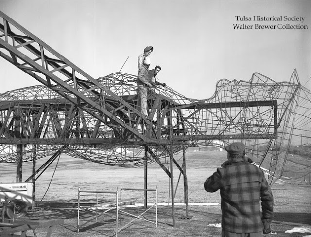 The late Tulsa photographer Walter Brewer documented construction of the giant with images later donated to the Tulsa Historical Society. Designated a state monument and refurbished again in 1979 (the year Hondronastas died), the statue as it appears today was permanently installed at East 21st Street and South Pittsburg Avenue.