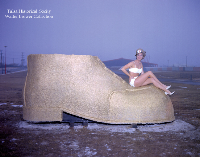 An unidentified model posed on one of the Golden Driller’s shoes, probably sometime during construction of the permanent version in time for the opening of Tulsa’s 1966 International Petroleum Exposition.