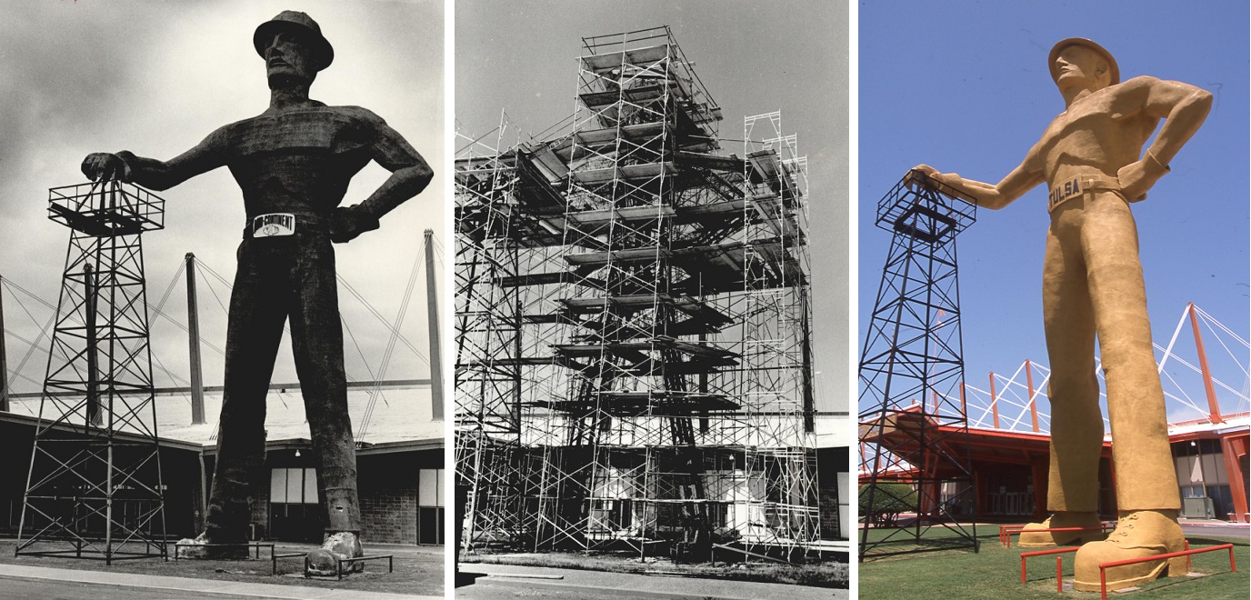 According to the society’s “Tulsa Gal,” the 1959 rig-climbing roustabout’s popularity inspired Mid-Continent Supply to donate it to the Tulsa County Fairgrounds Trust Authority when the international expo ended. Sometime during the next seven years, the giant was redesigned to better withstand the elements, she noted.