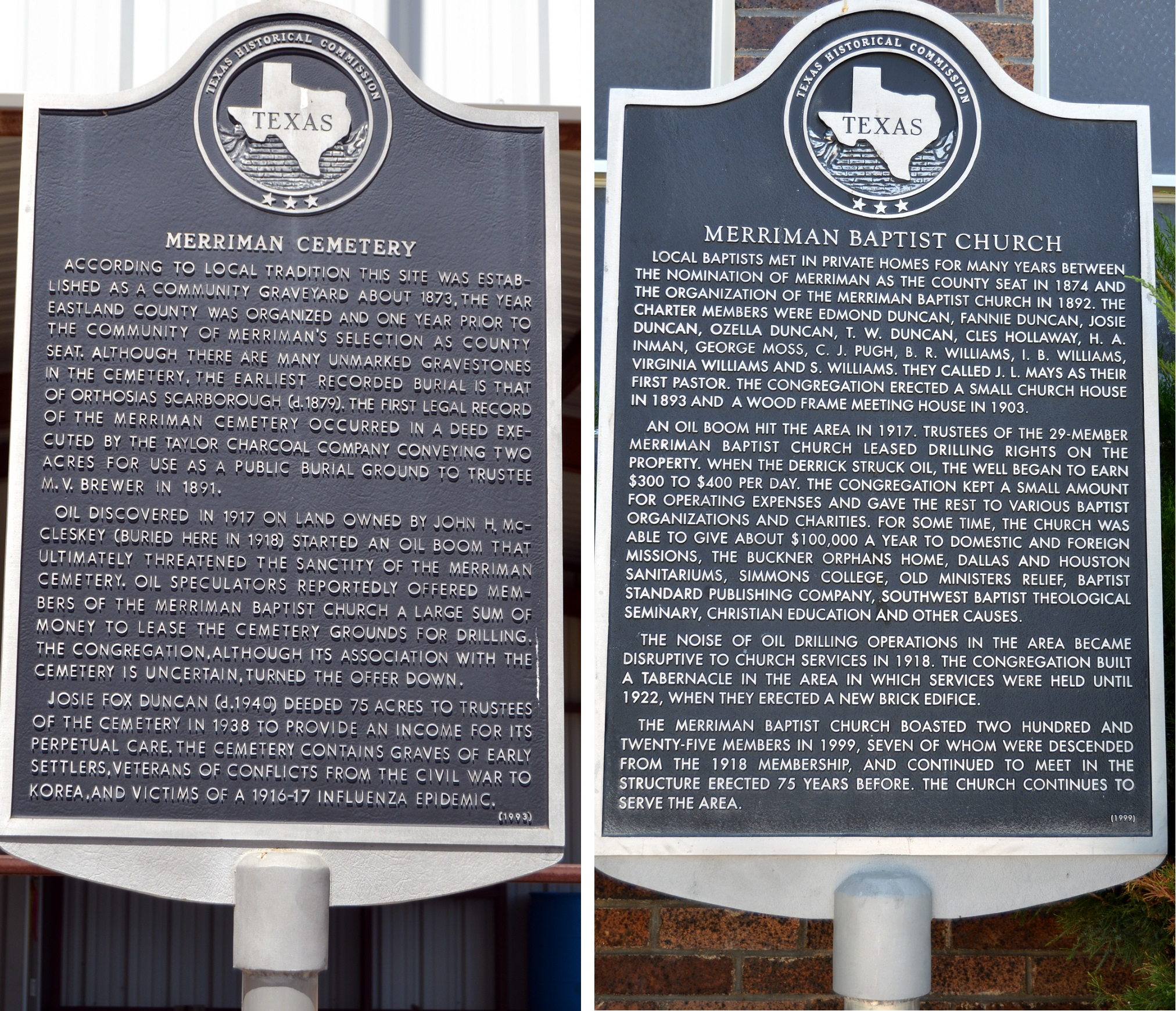 Near Ranger in Eastland County, Texas Historical Commission markers were erected in 1993 (left) and 1999 explaining how members of the Merriman Baptist Church shared their wealth from petroleum royalties. Photos courtesy the Historical Marker Database.