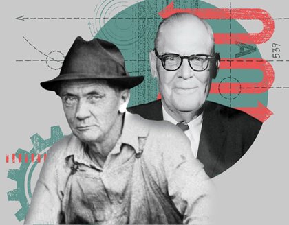 Independent producer James Abercrombie (right) and machinist Harry Cameron helped stop eruptions due to inadequate pressure control. Photo courtesy American Society of Mechanical Engineers.