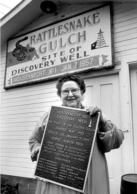 After two years of drilling, a wildcat well on Ferne Houseknecht’s Michigan dairy farm discovered the state’s largest oilfield. The 3,576-foot-deep well produced from the Black River formation of the Trenton zone.