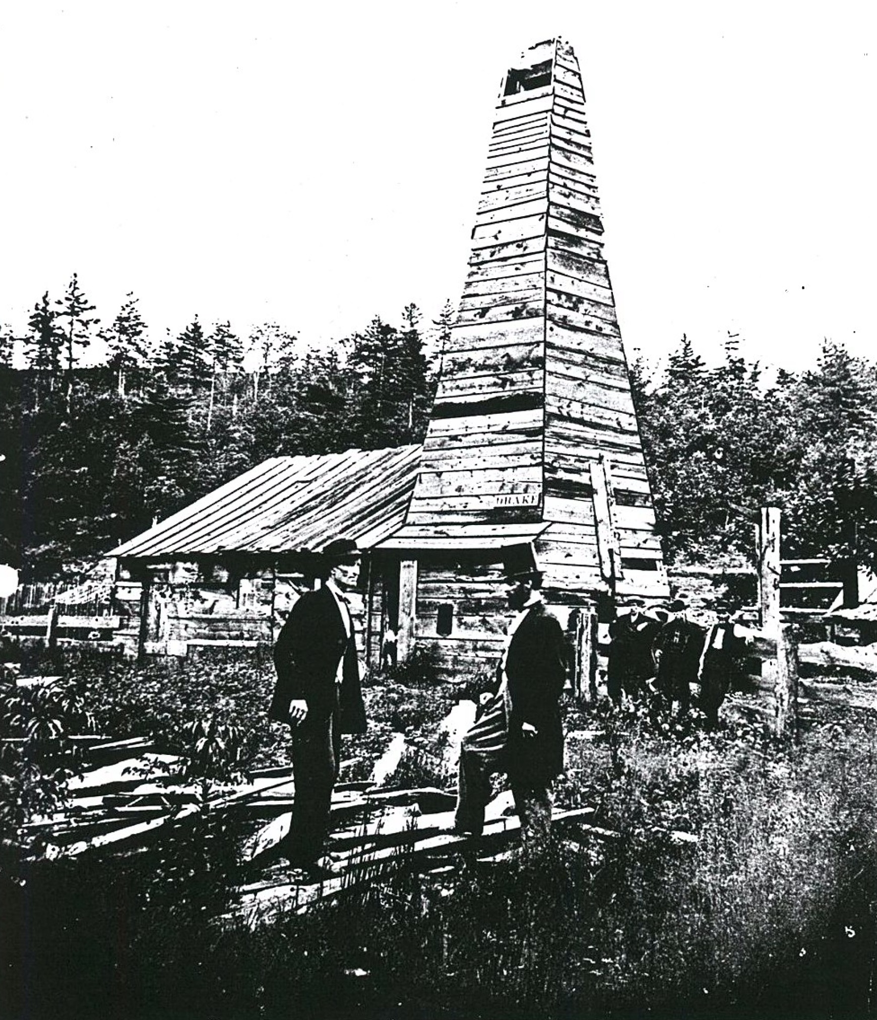 Iconic but often misidentified photo by John A. Mather shows Edwin L. Drake (at right) with a friend standing in front of the rebuilt engine house and derrick at the original site of the first U.S. commercial oil well of August 1859. An October fire destroyed the original structures. Photo courtesy Drake Well Museum.