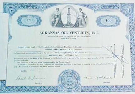 Citation Information – Article Title: “Arkansas Oil Ventures.” Authors: B.A. Wells and K.L. Wells. Website Name: American Oil & Gas Historical Society. URL: https://aoghs.org/old-oil-stocks/arkansas-oil-ventures. Last Updated: January 5, 2026. Original Published Date: April 20, 2015.