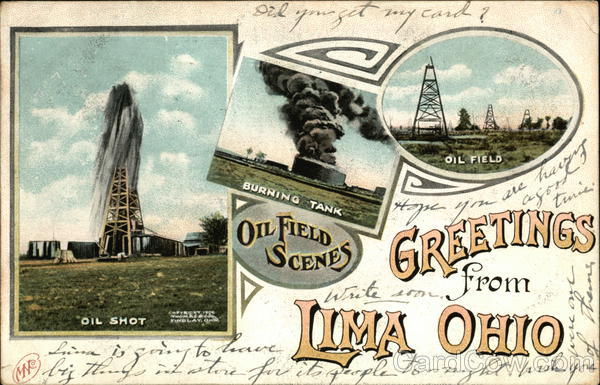 Postcards promoted a community’s petroleum prosperity with images of gushers and burning oil tanks. The Lima oilfield was discovered in 1885. Circa 1910 postcard published by Robbins Bros., Boston.
