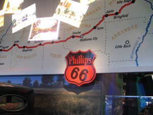 Among the exhibits are images of Route 66, which was commissioned in 1926 and fully paved by the late 1930s. A prominent Tulsa, Oklahoma, businessman — who also invested in the petroleum industry – is credited with creating the enduring (and international) popular identity of Route 66.