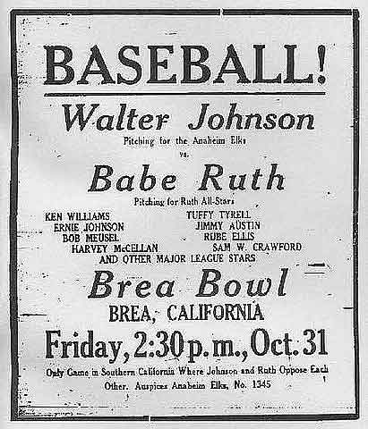 In 1936, “The Big Train” Johnson was inducted into baseball’s newly created Hall of Fame with four others: Ty Cobb, Babe Ruth, Honus Wagner, and Christy Mathewson. In 1924, Johnson returned to his California oil-patch roots. On October 31, he and his former baseball teammates played an exhibition game in Brea against Babe Ruth and the Ruth All-Stars.