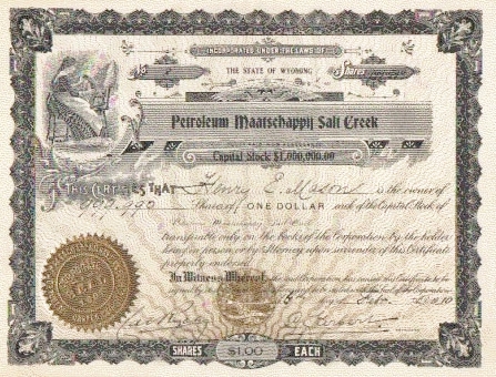 Shannon and his associates incorporated as the Pennsylvania Oil and Gas Company with 6,000 shares of stock. The company’s assets included the Casper refinery and placer claims on over 3,000 acres of the north perimeter of Salt Creek.