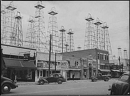 “World’s Richest Acre Park, where once stood the world’s greatest concentration of oil wells.” A street scene in Kilgore, Texas, depicting steel derricks behind stores, is one of many by Russell Lee (1903-1986) preserved by the Library of Congress.