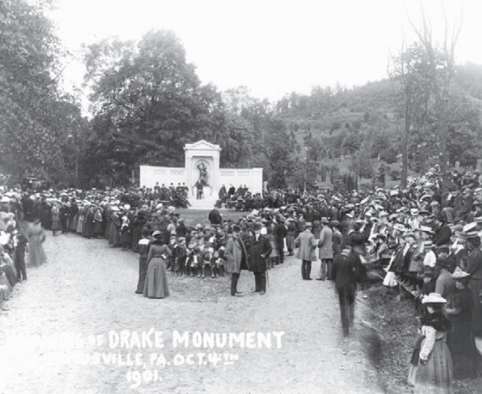 Unveiling of the Drake Monument in Titusville, Pennsylvania, on October 4,1901. Thousands attended the dedication in Woodlawn Cemetery. Photo by John Mather courtesy Drake Well Museum.