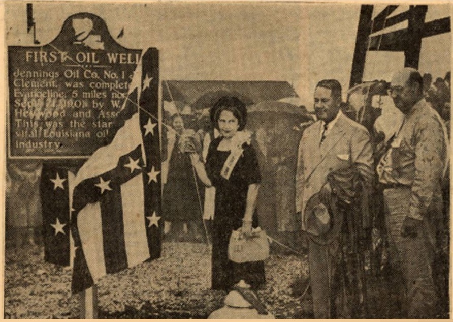 Mrs. Scott Heywood unveiled a marker as part of the Louisiana Golden Oil Jubilee in 1951. Times-Picayune (New Orleans) image courtesy Calcasieu Parish Public Library.