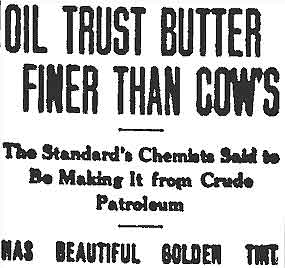 “The Standard Oil Company has decided to drive the cow and the dairyman out of business,” declared the Stanstead Journal of Quebec, reporting from Jersey City, New Jersey. “Its skilled chemists have discovered a process whereby they can make gilt-edge butter as a byproduct of crude petroleum.”