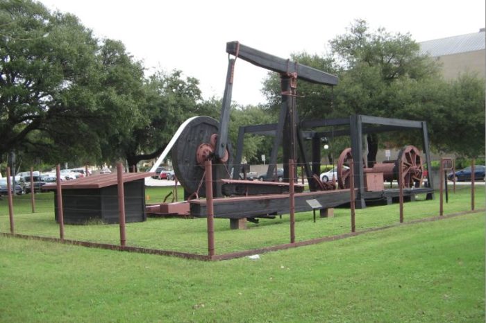 Outdoor exhibits include a replica 72-foot standard cable-tool derrick and engine house, and guided tours by oil country veterans educate visitors about “yellow dogs and barkers, headache posts, hurry-up sticks and sucker rods.”