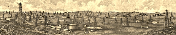 In the rush to print stock certificates during oil booms, new companies often chose to print certificates using a vignette of derricks. Many ended up using the exact same scene of derricks in an oilfield.