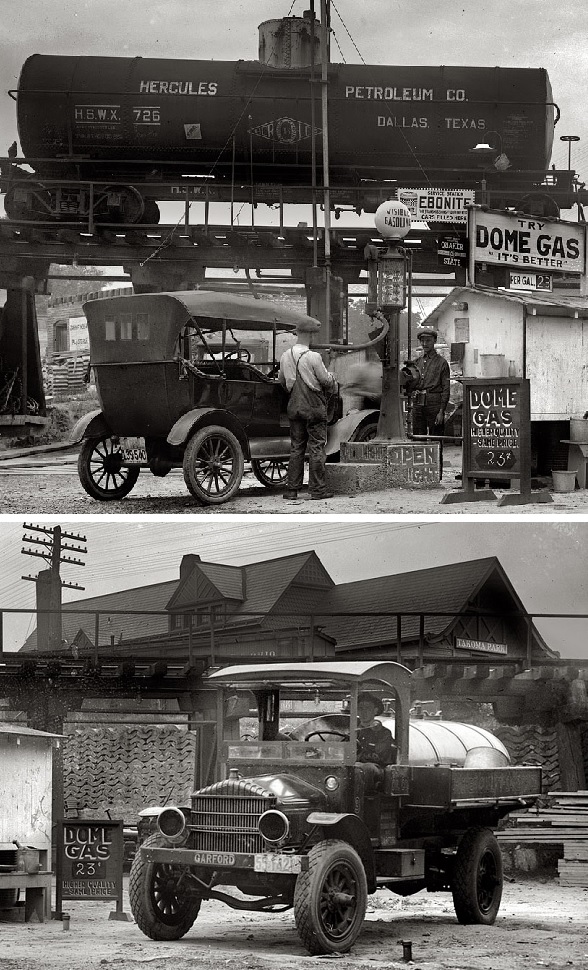 In the absence of underground storage tanks at the time, railroad tank cars like that of Hercules Petroleum Company were often used as temporary storage. Hercules Petroleum of West Dallas, Texas, had a controversial association with Ajax Oil Company, including Hercules Petroleum stock sales being manipulated by sales agents of Farson, Son & Company.