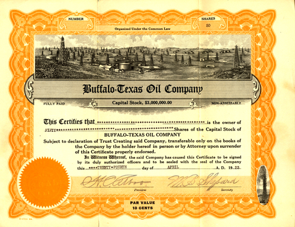 Buffalo-Texas Oil Company’s stock certificate includes a vignette of derricks. The very same scene can be found on certificates from other quickly organized oil exploration companies.