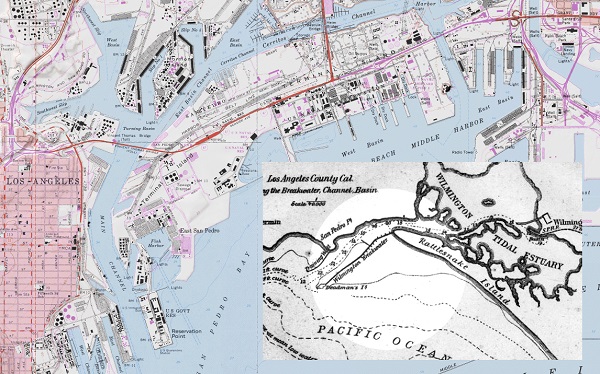 Dead Man’s Island and Rattlesnake Island (both now part of the largely artificial Terminal Island) were first linked in 1893. Modern dredging has changed much of the harbor’s landscape.