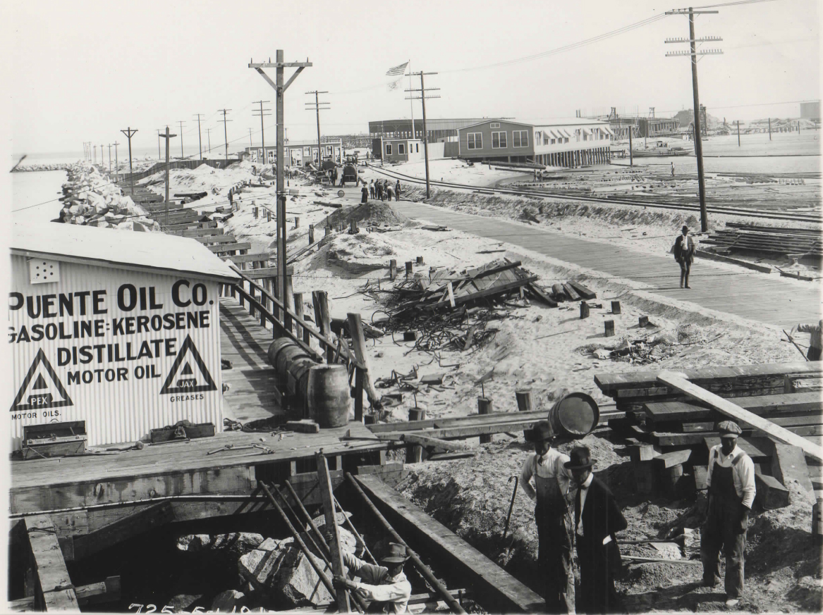 Old and new technologies are seen at the harbor site as well – Nellie Bly’s 55-gallon steel drums and old 42-gallon wooden barrels; the sails and train rails with log drivers (catty men, river rats, river pigs, etc.) corralling floating pilings; and on South Seaside Avenue, the Puente Oil Company – the first to exploit southern California’s Puente Hills’ petroleum resources.