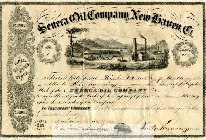 Investors from New Haven, Connecticut, organized the Seneca Oil Company with $300,000 in capital after purchasing the Titusville leases of the Pennsylvania Rock Oil Company, which had been founded in 1854 by George Bissell.