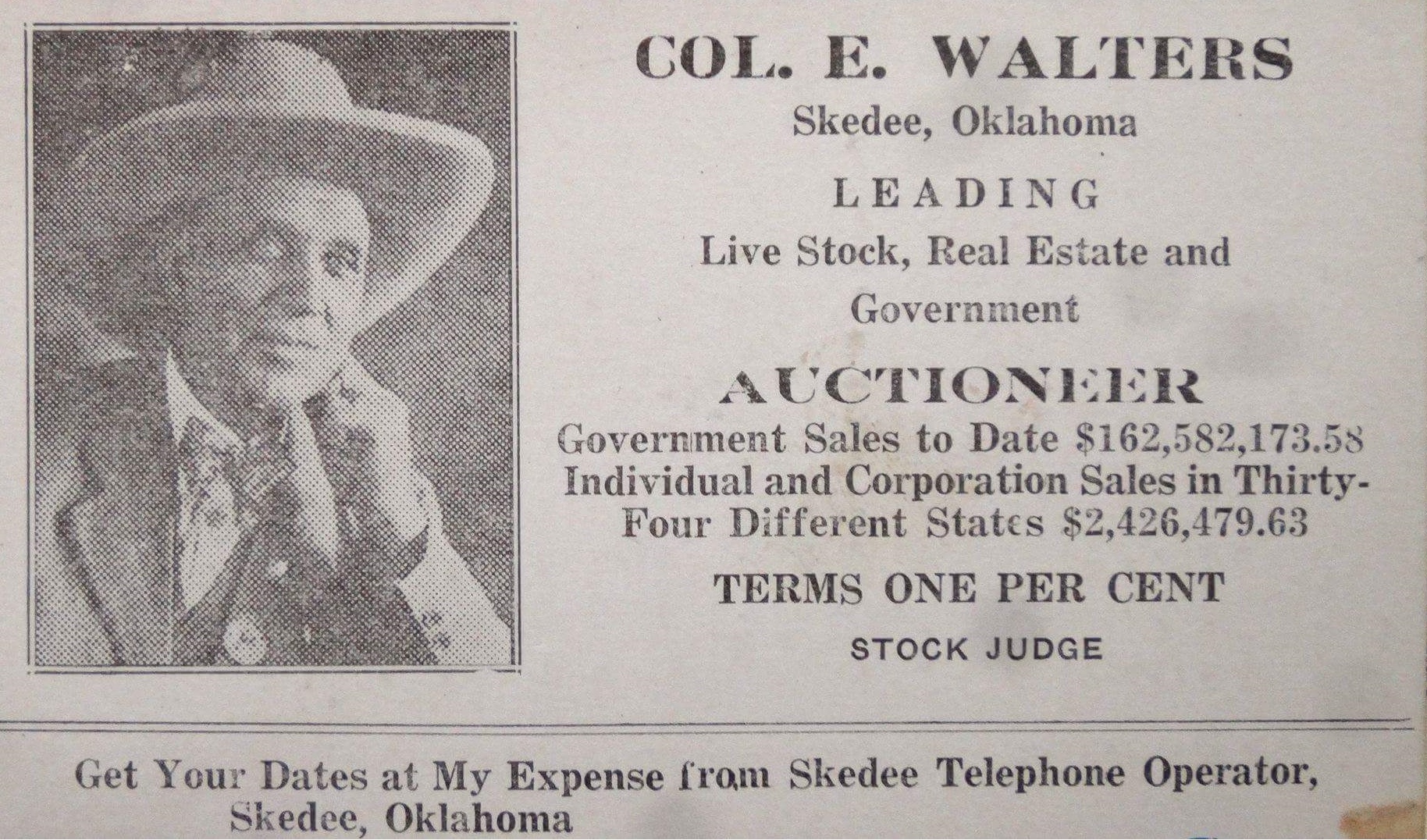 Colonel Elmer Ellsworth (his real name) Walters was the most famous auctioneer in all of Oklahoma history. In 1912, the Osage Indians hired him to auction mineral rights from their petroleum-rich reservation. By 1920, they had awarded him a gold medal for his skillful sales of Osage oil leases.