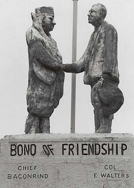 On April 22, 1926, hundreds gathered in Walter’s longtime home of Skedee for the dedication of a 25-foot Bond of Friendship monument. The unveiling revealed “painted bronze” statues of Walters and the chief of the Osage Nation shaking hands on a two-tiered sandstone and concrete base.