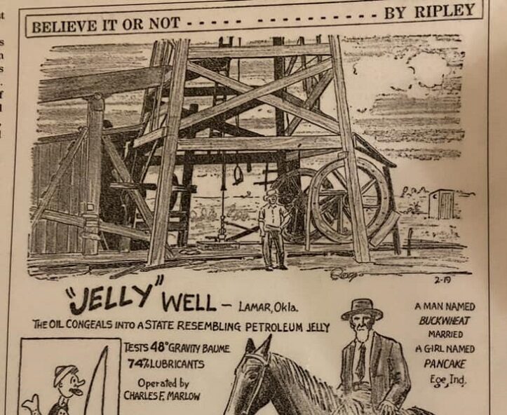 High-viscosity oil from the 1921 Oklahoma well was featured by the syndicated Believe It or Not by Ripley. Illustration courtesy Hughes County Historical Society.