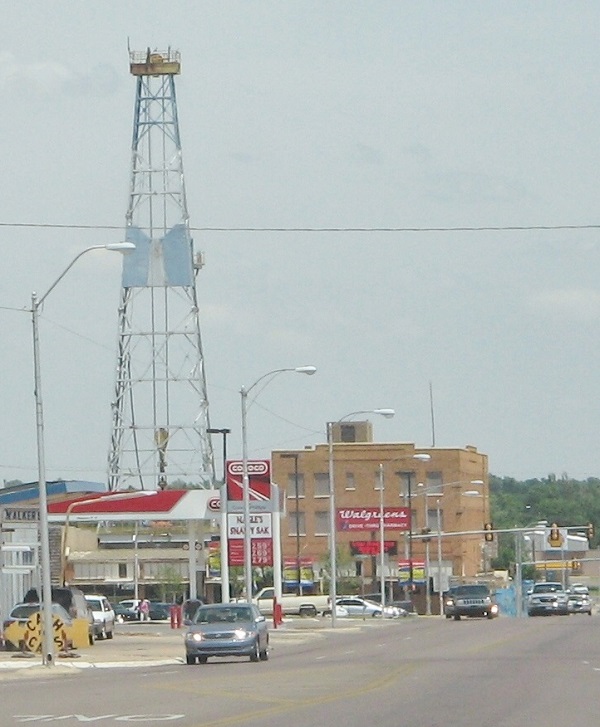 The 181-foot Parker No. 114 towers over Elk City’s former Casa Grande Hotel at the intersection of 3rd Street and Route 66. The Casa Grande, which opened in 1928, was added to the National Register of Historic Places in 1995; it was once home to a natural history museum that included petroleum exhibits.