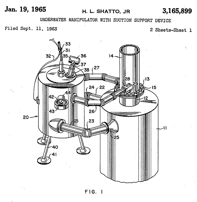 Howard Shatto Jr. received a 1965 U.S. patent for his “underwater manipulator with suction support device.” His concept led to the modern remotely operated vehicle (ROV) now used most widely by the offshore petroleum industry. Shatto helped make Shell Oil Company an early leader in offshore oilfield technologies.