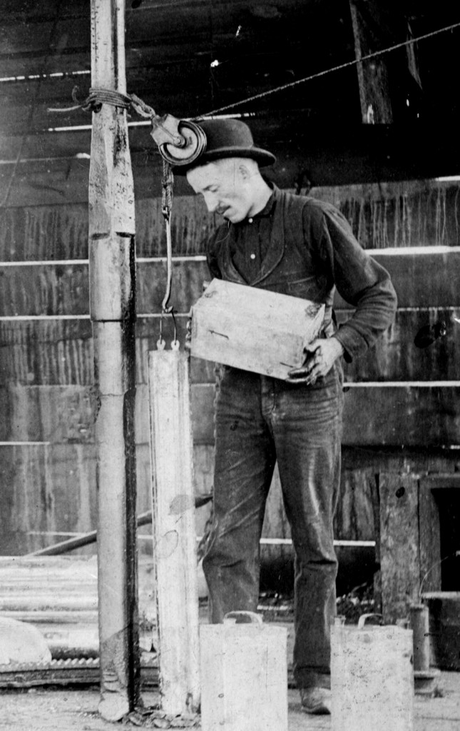 Pouring nitroglycerin into a canister prior to the “shooting” of a well drilled using a cable-tool rig.