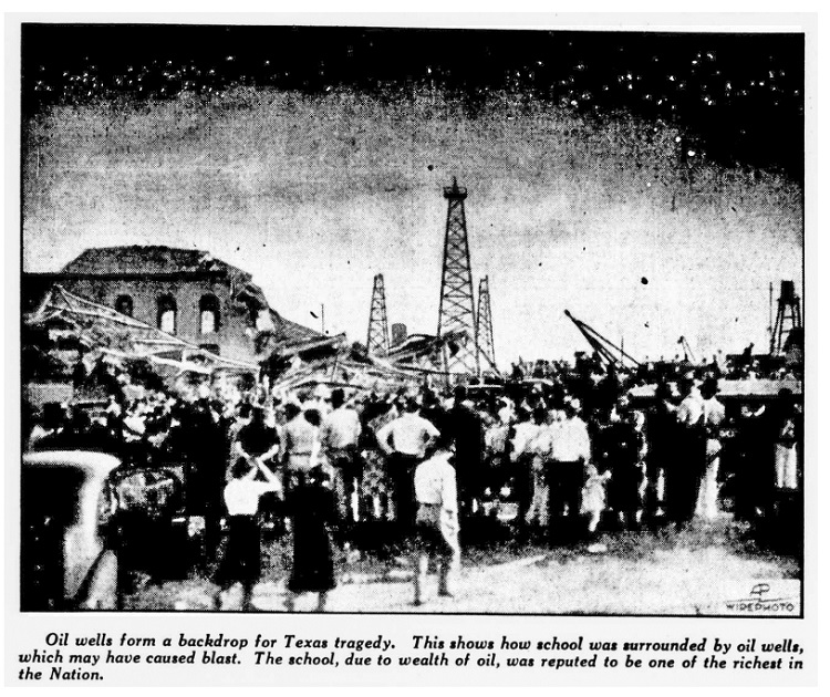 Hundreds died at New London High School in Rusk County after odorless natural gas leaked into the basement and ignited. The sound of the explosion was heard four miles away. Parents, many of them roughnecks from the East Texas oilfield, rushed to the school.