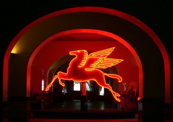In 1955, the name of the company changed to Socony Mobil Oil; in 1966, it became just Mobil Oil. A neon Mobil Oil Pegasus displayed at the 1939 New York World’s Fair found its way to a Mobil gas station in Casa Linda, Texas, and later to the Old Red Museum of Dallas County History & Culture.
