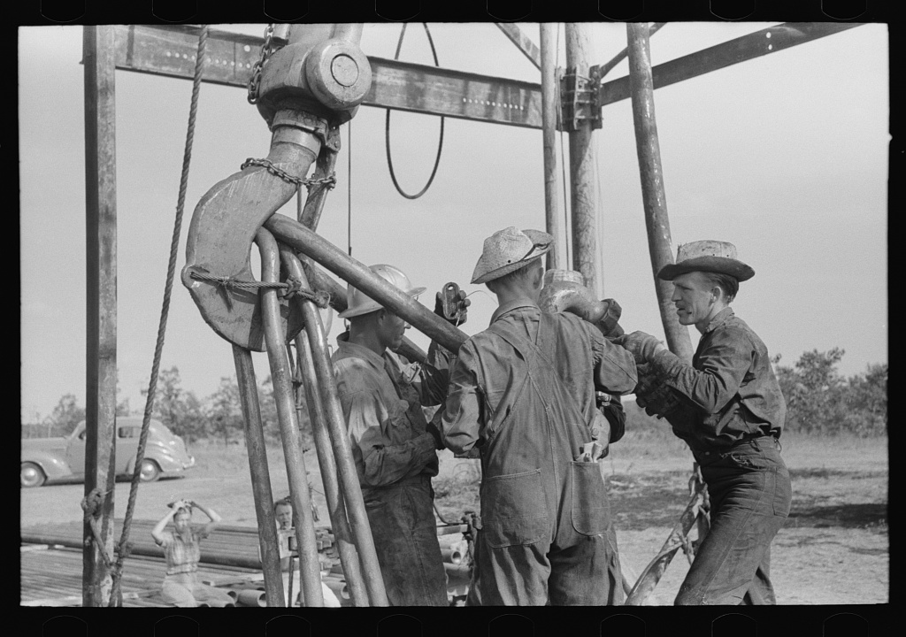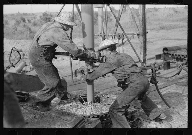 Oilfield roughnecks at work during Oklahoma’s Greater Seminole Area boom of the 1930s. Photo by Russell Lee for Farm Security Administration, courtesy Library of Congress.