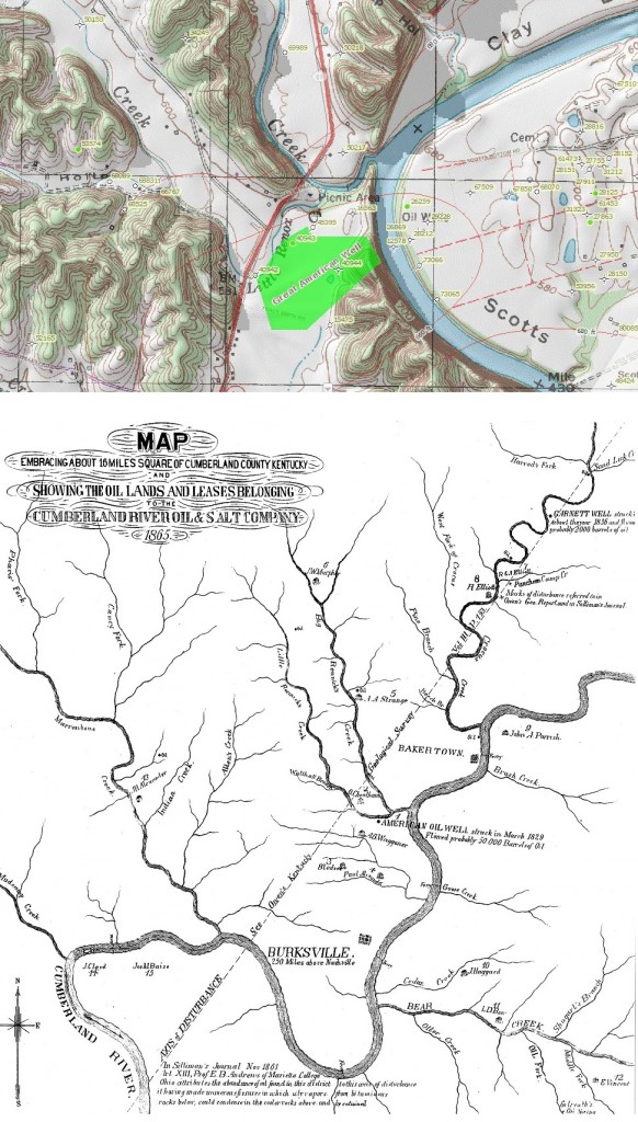 An 1865 Kentucky State Geology Survey map, “embracing about 16 miles square of Cumberland County,” includes the March 11, 1829, Great American Oil Well — drilled for brine but producing oil bottled and sold for “medicinal” purposes.