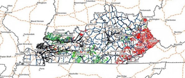 Kentucky today has produced oil and natural gas in 52 counties. Oil production (green) is in the western and south-central areas. Most natural gas (red) is in eastern counties. Cumberland County is on the Tennessee border in the middle of the state.