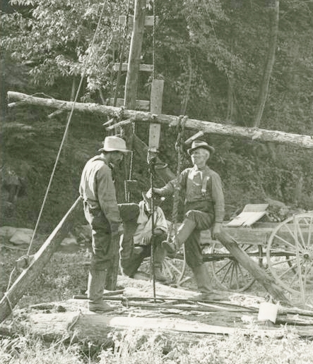 The Cumberland County well was drilled “using an apparatus consisting of a spring pole made from a strong sapling, set in the crotch of a tree.” The driller manipulated a heavy bit fastened to the free end of the pole by using his foot. It was a slow task requiring frequent stops; as wells got deeper, steam-powered cable tools came into use (see Making Hole – Drilling Technology).