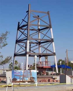 A roughneck monument with a 30-foot-tall derrick was dedicated in Taft, California, in 2010. Photo courtesy West Kern Oil Museum.