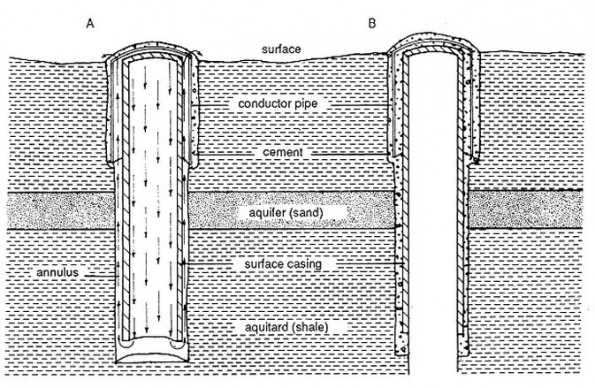 Steel casing is installed in the surface hole to prevent the contamination of freshwater zones. (A) The conductor pipe has been cemented into place. Cement is pumped down the inside of the casing. (B) The cement in the bottom of the casing has been drilled out so that drilling can be resumed. Illustration courtesy the Kansas Geological Survey.