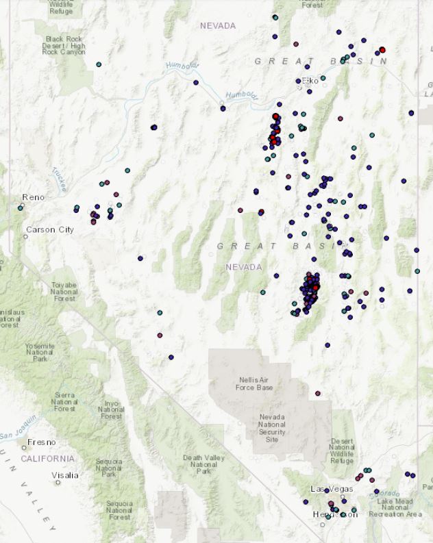 Detail from a 2013 map of Nevada oil and natural gas wells with red dots indicating producing wells. Data provided by University of Nevada, Reno, courtesy the Conservation Biology Institute.