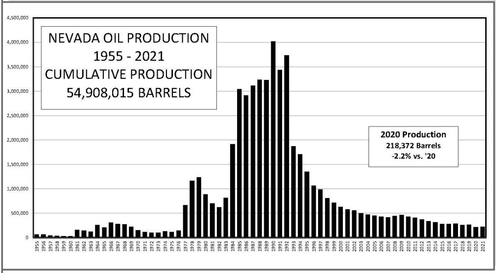 “Most of the oil has come from the Great Basin in the eastern part of the state, primarily Railroad Valley (Nye and White Pine counties) and Pine Valley (Elko and Eureka Counties), the report noted. The state’s peak production exceeded 4 million barrels if oil in 1990.