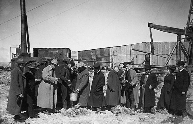 “Buffalo Bill” Cody (center right, black hat) and investors inspect oil sample of the Shoshone Anticline near Cody, Wyoming, circa 1910. Photo courtesy the American Heritage Center, University of Wyoming.