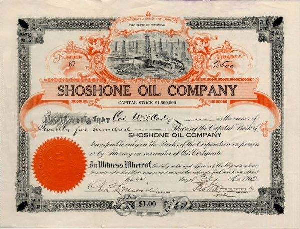 A stock certificate for 2,500 shares valued at $1 per share issued to W. F. Cody by Shoshone Oil Company, Cody, Wyoming, on February 4, 1910. Shoshone Oil Company today survives only as a collectible stock certificate. Image courtesy Buffalo Bill Center of the West.