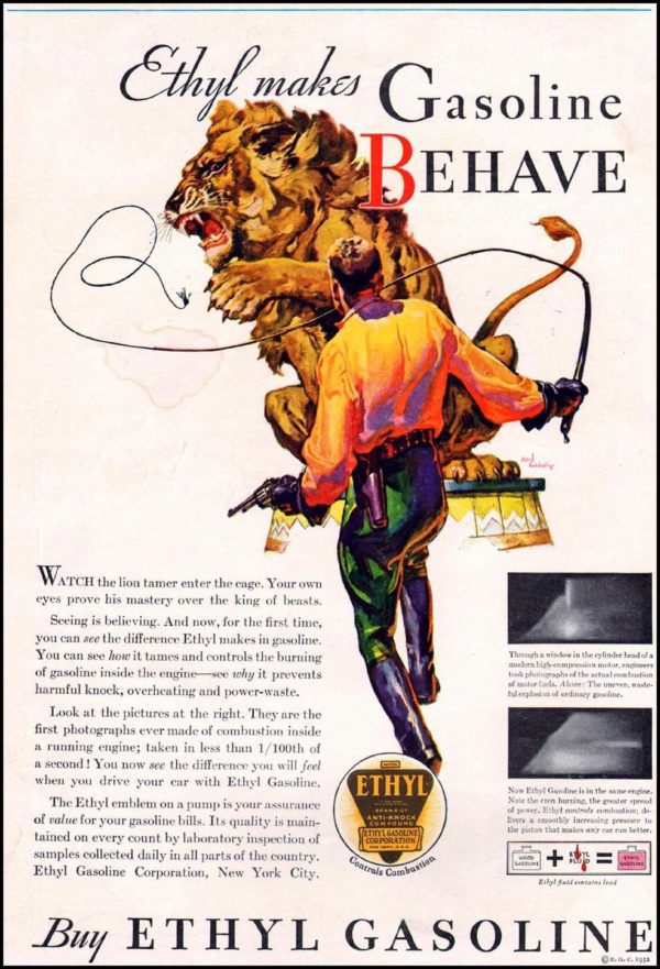 General Motors scientists in 1921 discovered the anti-knock properties of tetraethyl lead as an additive to gasoline. By 1923, many American motorists would be driving into service stations and saying, “Fill ‘er up with Ethyl.”