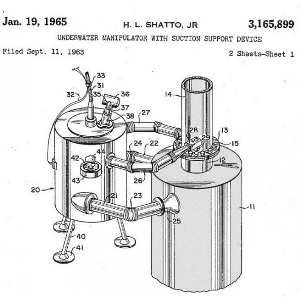 The inventor added that a primary objective of his design is to provide a “manipulator device” with articulated arms that can secure itself to a wellhead on the ocean floor. “Each of the arms is provided at its outer end with a suitable suction means in the form of a suction cup,” he explained.