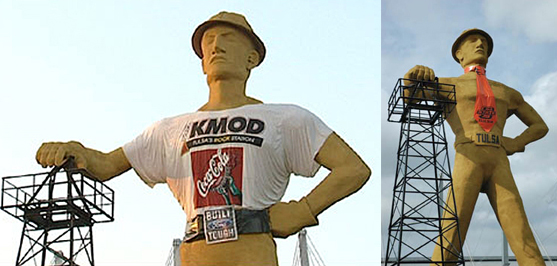 According to the society’s “Tulsa Gal,” the 1959 rig-climbing roustabout’s popularity inspired Mid-Continent Supply to donate it to the Tulsa County Fairgrounds Trust Authority when the international expo ended. Sometime during the next seven years, the giant was redesigned to better withstand the elements, she noted.
