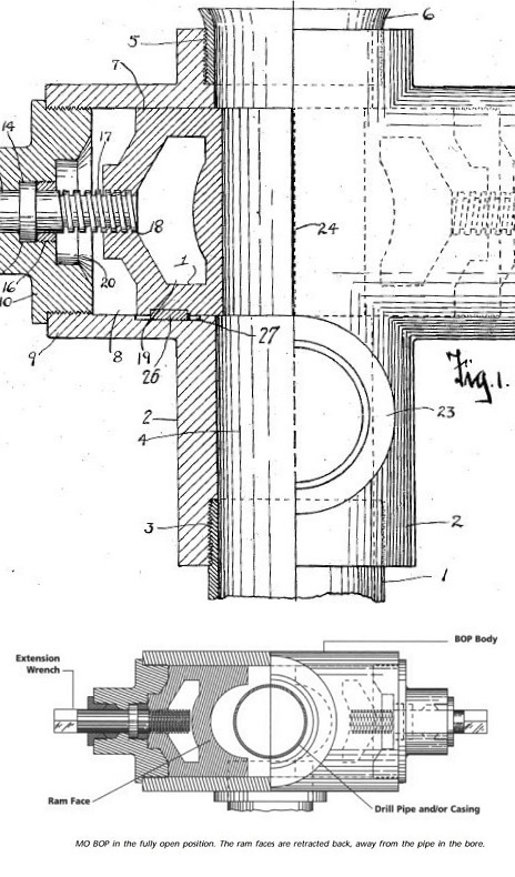 James Abercrombie and Harry Cameron in 1926 were awarded a U.S. patent (No. 1,569,247) for their Cameron Iron Works manually operated ram-type BOP.