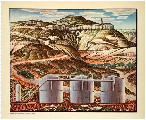 A 1937 painting by Alexandre Hogue depicts the Pecos, Texas, oilfield with storage tanks in the foreground and the green-roofed quarters for workers in the background.