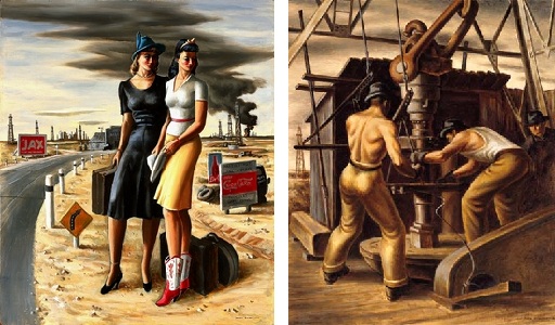 Dallas artist Jerry Bywaters painted “Oil Field Girls” in 1940 for the San Francisco Golden Gate International Exposition. He titled its companion piece “Oil Rig Workers (Roughnecks).”