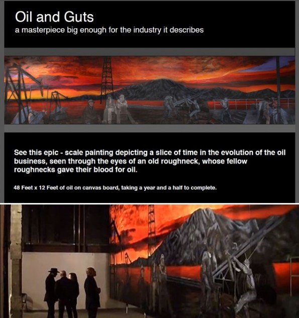 “Oil and Guts,” a transferable mural 48 feet by 12 feet, “narrates the evolution of the world of oil, a slice of time seen through the eyes of an old roughneck remembering guys that have given their blood for oil.”