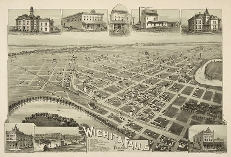 Viewed from the north looking south, Thaddeus Fowler depicted Wichita Falls, Texas, population 1,978, probably in late 1890. For a suitable fee, the artist included homes and businesses as insets. Source: University of Texas at Arlington Library.